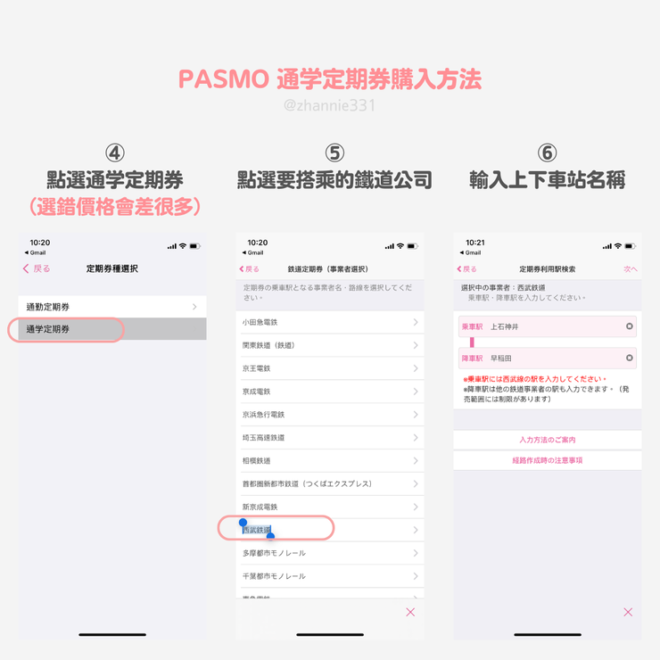 ⚠ 注意:住家起始站為西武新宿線,而西武新宿線對應的交通系IC卡公司是PASMO,因此購買時不能使用原本常用的SUICA,而是需要辦一張PASMO。