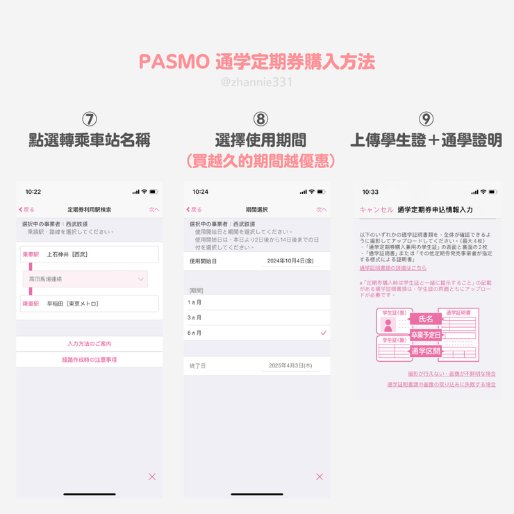 下載APP後依照以下流程申請定期券,大約一天之內會完成審核,使用Apple Pay付款完後就可以使用囉!本次購買6個月的費用共31870日幣(不同距離可能有所差異),一般到學校單趟來回440日幣,大約一個月出門12次就可以回本!而且綁在手機裡就不怕卡片弄丟了~